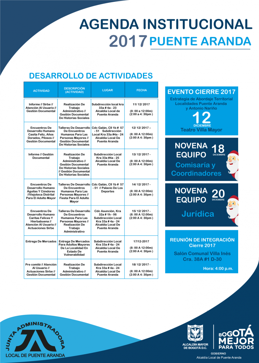 Agenda semanal Institucional Puente Aranda 2017 del 11 de Diciembre al 18 de Diciembre del 2017