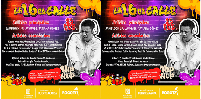 Bogotá D.C, 24 de febrero de 2024 - Este domingo 25 de febrero, desde las 10:00 a.m. hasta las 9:00 p.m., el Parque Cundinamarca, ubicado en la carrera 34 con calle 17, será el escenario de la versión número 16 del festival de Hip Hop: La 16 Es Calle, organizado por la Alcaldía Local de Puente Aranda. Este evento emblemático reúne a la comunidad en un ambiente de arte, música y cultura urbana.