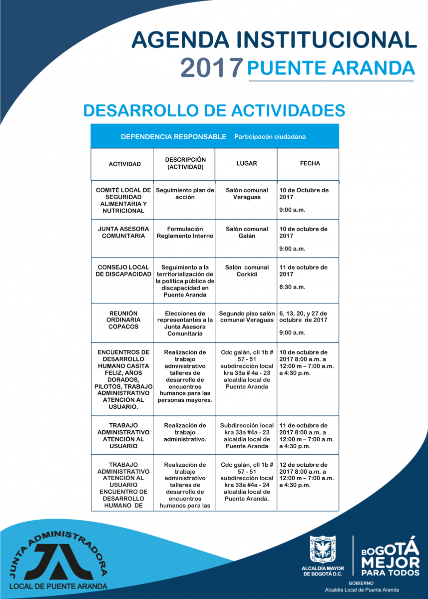 Agenda Semanal Institucional Puente Aranda Del 10 de Octubre al 16 de Octubre de 2017