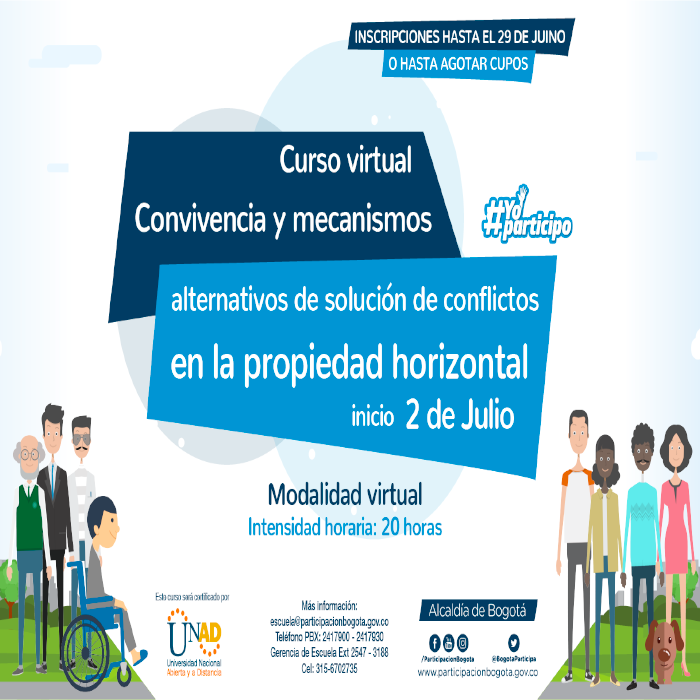 La Alcaldía Mayor de Bogotá a través del Instituto Distrital de la Participación y Acción Comunal, IDPAC, realizará el curso virtual " Convivencia y Mecanismos Alternativos de Solución de Conflictos en la Propiedad Horizontal"