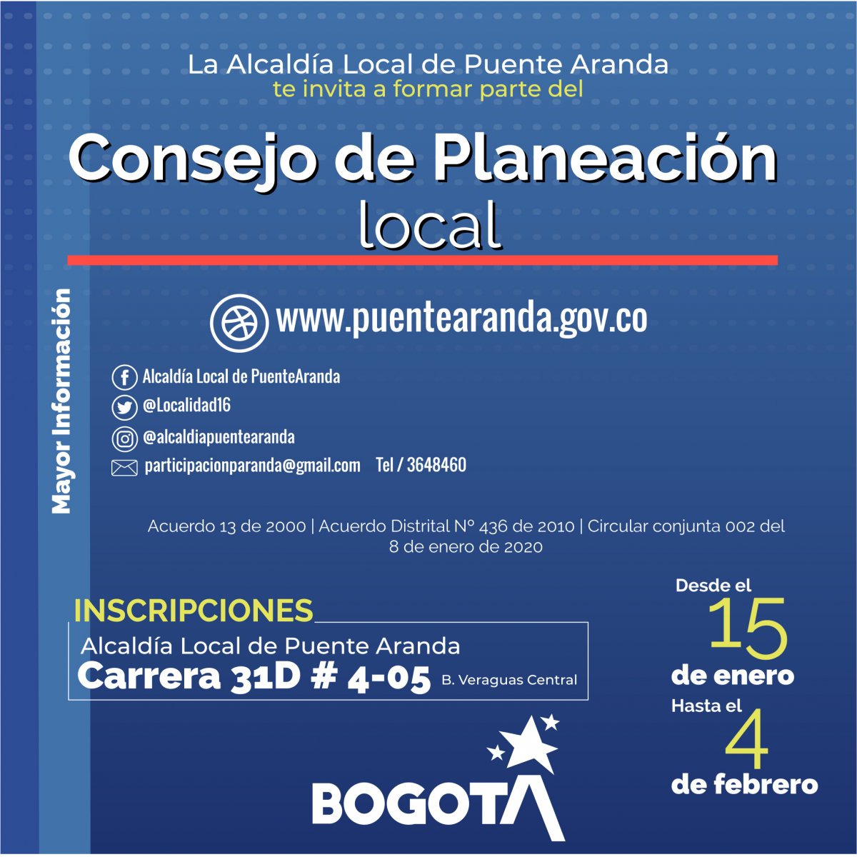 EN EL MARCO DEL ACUERDO 13 DE 2000, ADICIONADO POR EL ACUERDO DISTRITAL Nº 436 DE 2010, LA ALCALDESA LOCAL DE PUENTE ARANDA, CONVOCA A TODOS LOS CIUDADANOS PERTENECIENTES A LAS SIGUIENTES ORGANIZACIONES, PARA QUE PARTICIPEN EN LA CONFORMACIÓN DEL CONSEJO DE PLANEACION LOCAL: