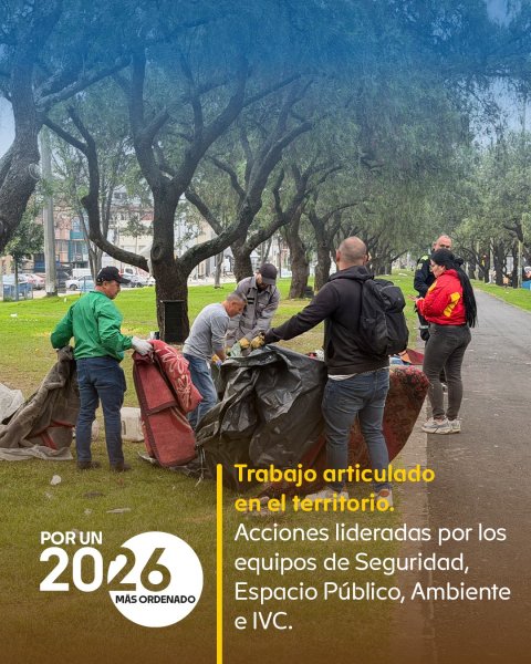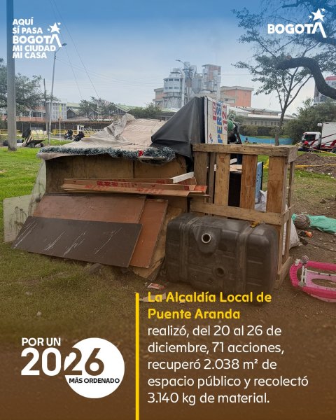 Entre el 20 y el 26 de diciembre, la Alcaldía Local de Puente Aranda adelantó 71 acciones interinstitucionales orientadas a fortalecer la seguridad, el cuidado del entorno y la recuperación del espacio público en la localidad. Como resultado de estas intervenciones, se recuperaron 2.038 metros cuadrados de espacio público y se recolectaron 3.140 kilogramos de material, beneficiando directamente a la comunidad.