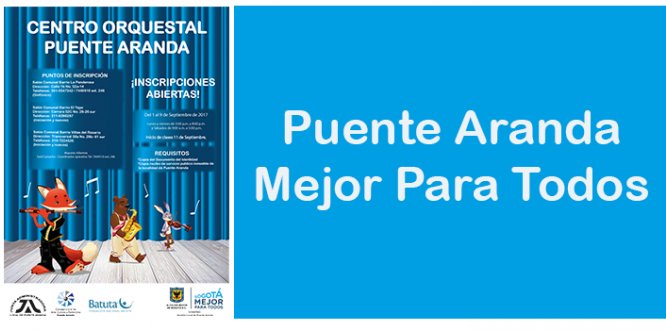 La Alcaldía Local de Puente Aranda informa a las personas interesadas en participar en el Centro Orquestal de la localidad, que las inscripciones estarán abiertas desde el próximo 1 de septiembre hasta el 9 del mismo mes en el horario de lunes a viernes de 3:00 p.m. a 8:00 p.m. y sábados de 9:00 a.m. a 5:00 pm. en los siguientes puntos: