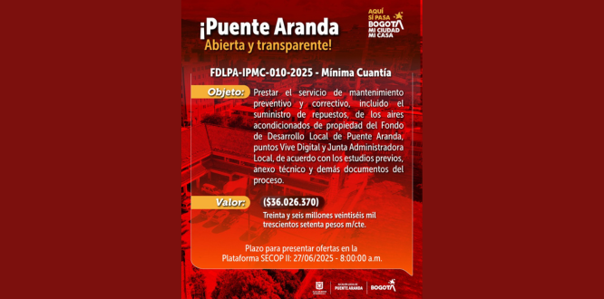 La Alcaldía Local de Puente Aranda continúa fortaleciendo la gestión pública transparente y eficiente, publicando el proceso FDLPA-IPMC-010-2025, bajo la modalidad de mínima cuantía.